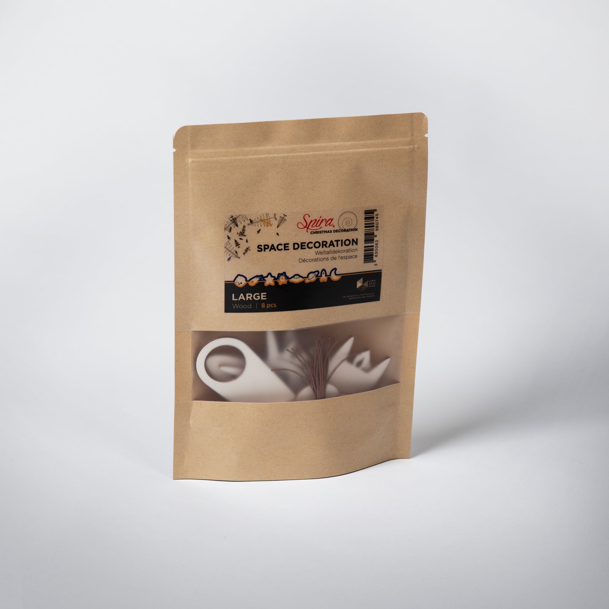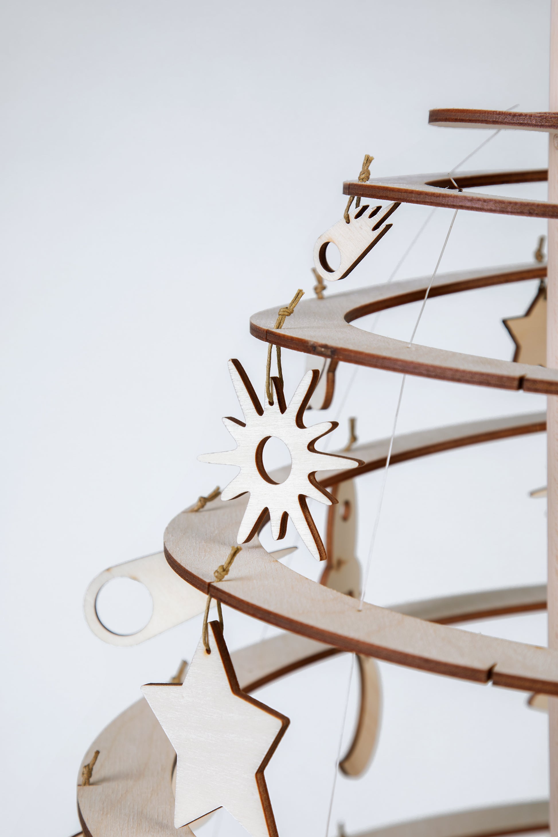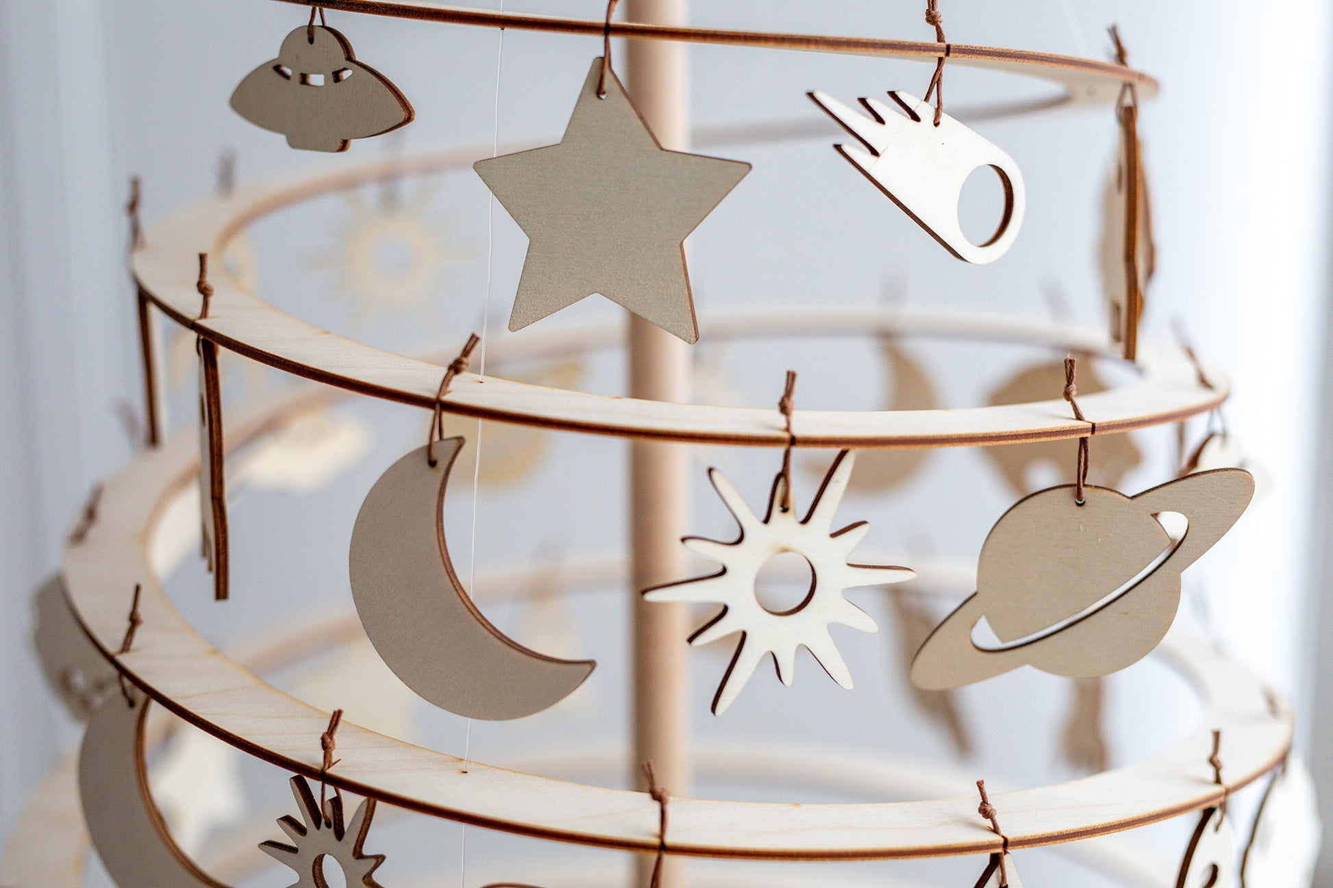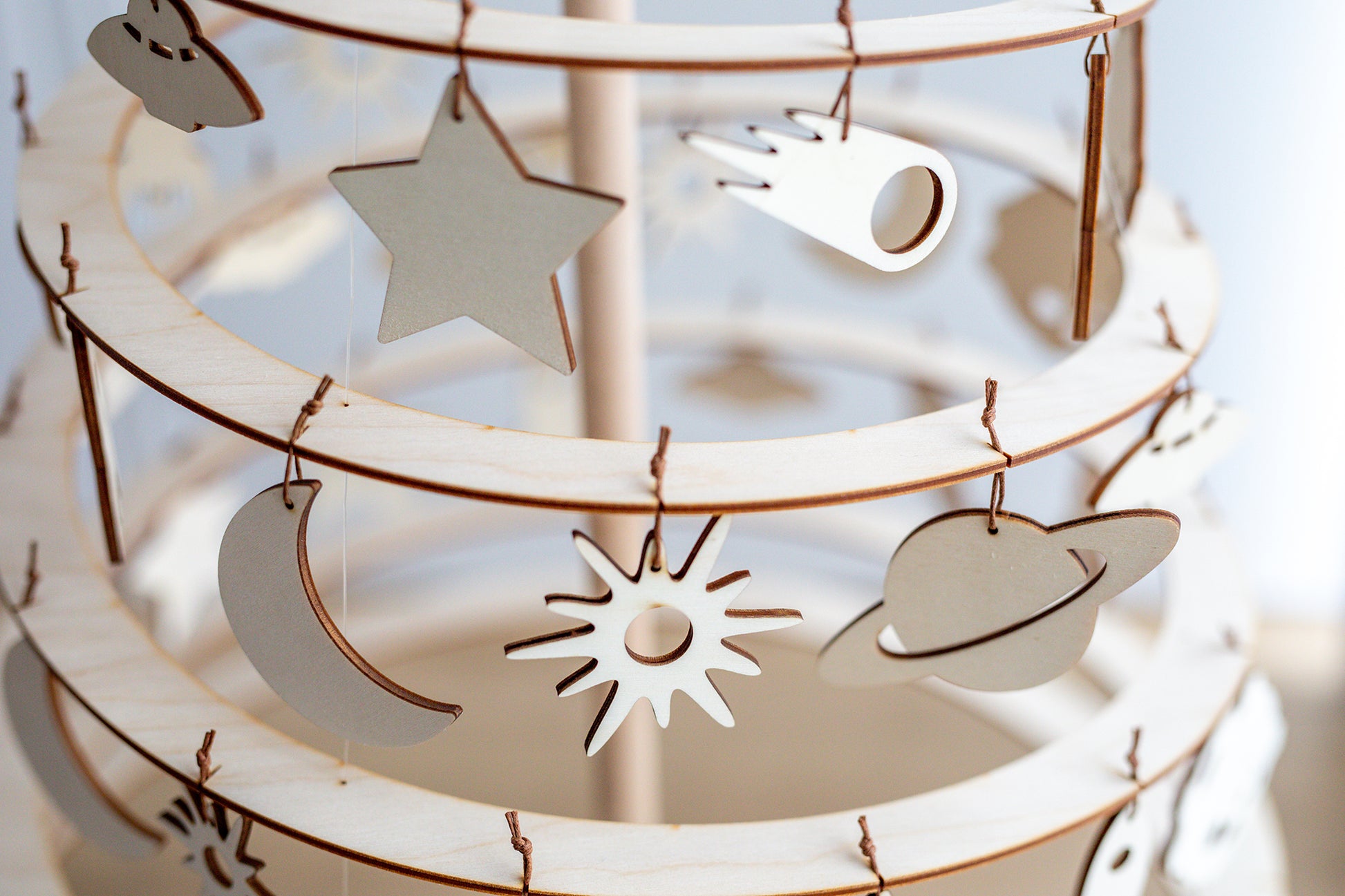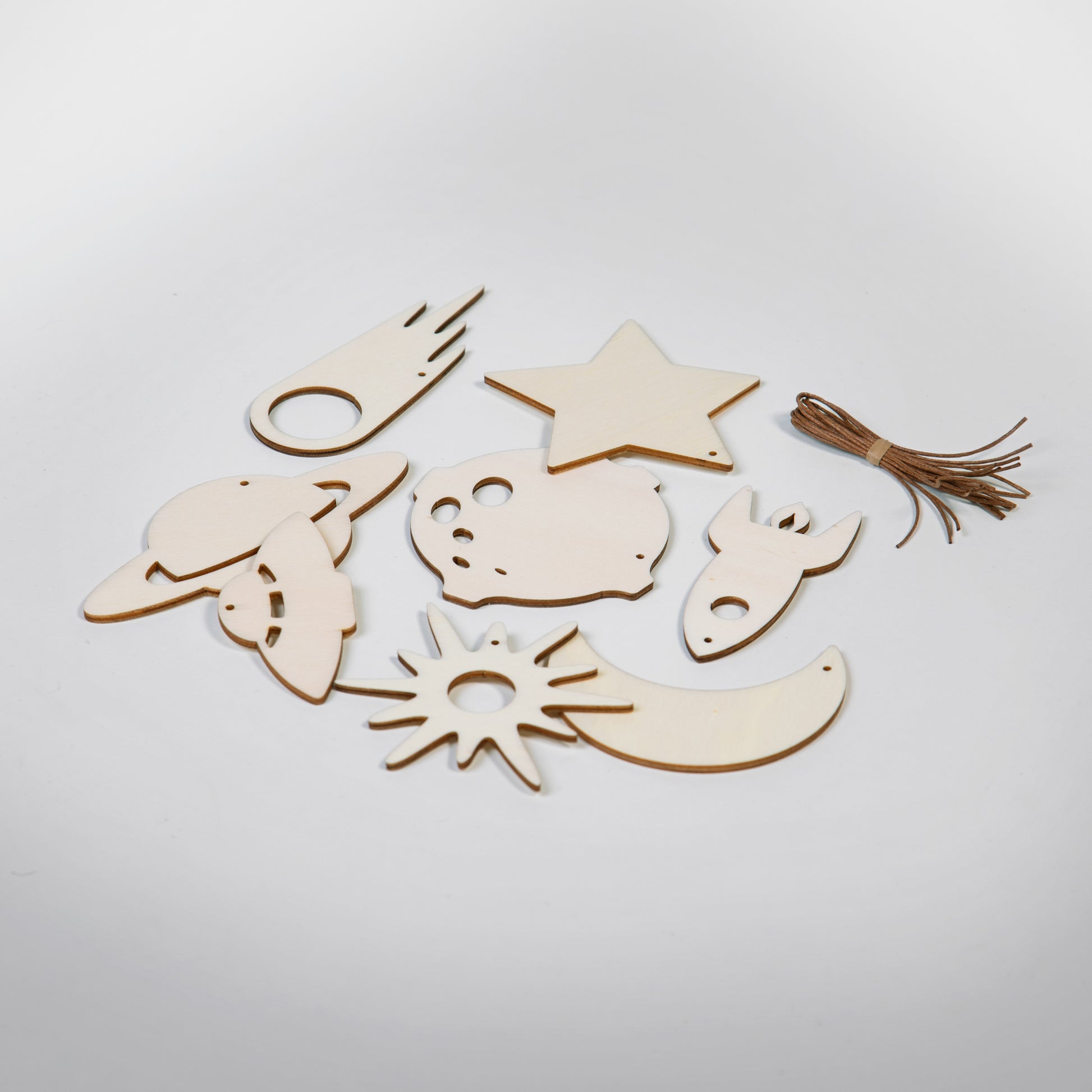 Un ensemble d'ornements en bois de différentes formes sur le thème de l'espace est un excellent choix pour les intérieurs modernes et classiques. Le design intemporel et la chaleur du bois assurent une décoration de Noël parfaite pour chaque maison.
