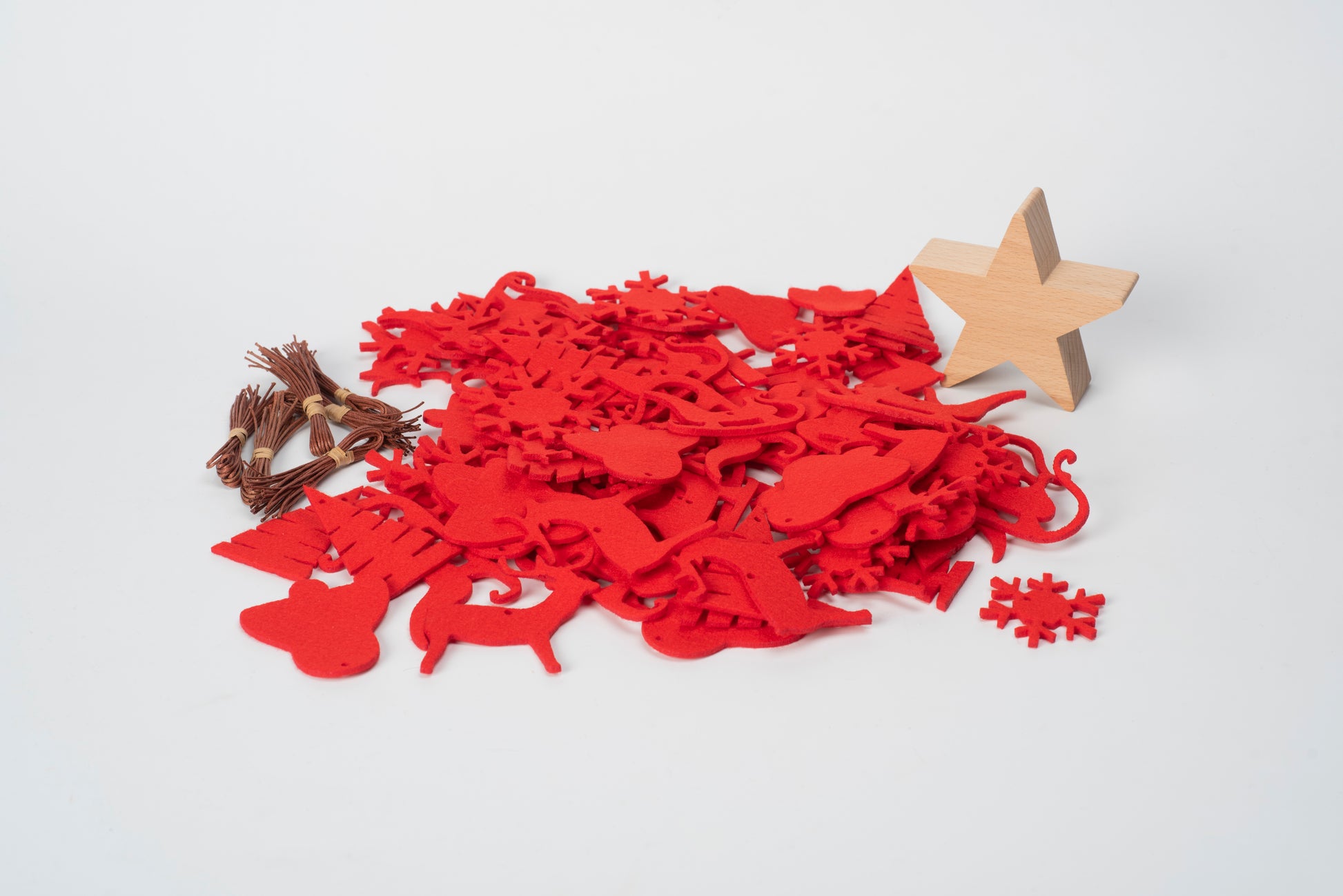Un ensemble de décorations en feutre rouge et une étoile en bois pour sapins de Noël Spira de toutes tailles. De jolies décorations créeront une atmosphère festive parfaite à la maison. Il ne manque plus que le dîner de Noël et les personnes qui comptent le plus pour vous